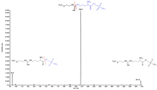 Reversed-phase chromatography was performed using a series 200 HPLC system (Perkin Elmer, Waltham, MA, USA) under gradient conditions with separation on a HILIC column, 3 µm, 100 A, 2.1 × 150 mm (Waters, Milford, MA, USA), coupled with a 3 µm, 3.9 × 5.0 mm guard column of the same material at the flow rate of 0.2 mL/min. Gradient features: 10% mobile phase (MP) A (NH4HCO2 10 mM, 10% CH3CN, 0.1% HCOOH) and 90% MP B (CH3CN, 0.1% HCOOH) as the initial constant condition; then to 90% MP A in 6 min and the constant condition for 1.5 min. Return to the start condition in 0.5 min and conditioning for 5.5 min. Total run time: 13.5 min. Mass spectrometric detection was performed using an API 4000 triple quadrupole mass spectrometer (SCIEX, Framingham, MA, USA) supplied with a Turbo Ion Spray source set at 350 °C and −4200 V, analyzing biological samples with electrospray ionization (ESI) operating in negative ion mode. Purified air was used as nebulizer gas (Gas 1) and heater gas (Gas 2) and N2 was used as curtain gas and collision activated dissociation gas. They were set to 40, 50, 20, and 4 instrument units (psi), respectively. The declustering potential (DP) was set at −119 V and the collision exit potential (CXP) at –10 V. All parameters of the source were defined by direct infusion of ZST316 and ZST152 1 µg/mL in mobile phase B. The final quantification was carried out in Selected Reaction Monitoring (SRM) with the following transitions: m/z 307.9 → 208.0 (collision energy of −29.5 eV) for ZST316 and m/z 271.9 → 170.9 (collision energy −24.7 eV) for ZST152 (Figure 2 and Figure 3). Data were processed with the software package Analyst 1.6.2 (AB SCIEX).