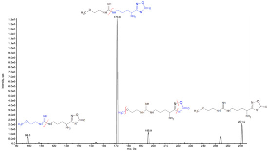 Analyte detection and quantification were carried out by tandem mass spectrometry (MS/MS) using the following mass transitions: 308.0 > 208.0 m/z for ZST316, and 271.0 > 170.9 m/z for ZST152. The detailed selected reaction monitoring (SRM) reporting the full fragmentation pattern of ZST316 and ZST152 obtained by MS/MS is shown in Figure 2 and Figure 3. Examples of chromatograms including a blank plasma and the lower limit of quantitation (LLOQ) samples are shown in Figure 4.