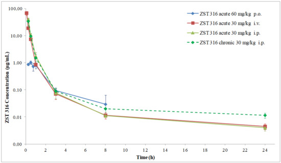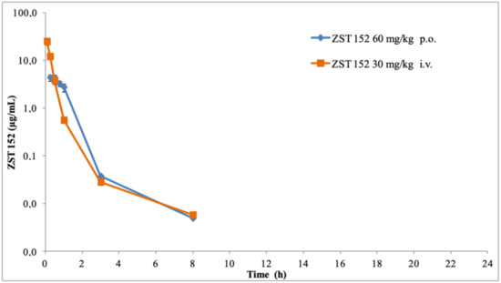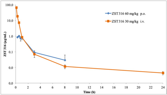The plasma pharmacokinetics of ZST316 and ZST152 after oral and intravenous administration and the derived parameters are shown in Figure 5 and Figure 6 and Table 6. After intravenous bolus administration of 30 mg/Kg, ZST316 achieved a Cmax of 67.4 µg/mL. Then, the compound was rapidly distributed and cleared from plasma with an elimination half-life of six hours. ZST316 was still detectable after 24 h at a concentration close to the LLOQ (i.e., 5 ng/mL) in two out of three samples. After oral administration, ZST316 achieved a Cmax of 1.02 µg/mL at 0.5 h and was measurable up to 8 h at a concentration of 0.029 µg/mL. ZST152, after intravenous administration of 30 mg/kg, achieved a Cmax of 24.9 µg/mL, distributed rapidly, and was cleared from plasma with an elimination half-life of 1.2 h. As a consequence of the relatively short half-life, ZST152 was detectable for up to 8 h at a concentration close to the LLOQ.