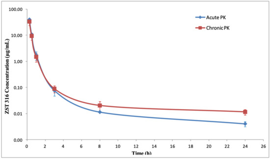 Plasma decay curves of ZST316 after acute and chronic intraperitoneal administration.