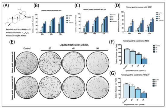 (A) Chemical structures of betulonic acid. (B) Growth inhibitory effects of betulonic acid on AGS. (C) Growth inhibitory effects of betulonic acid on HGC-27. (D) Growth inhibitory effects of betulonic acid on GES-1 cells treated with various concentrations of betulonic acid (20, 40, 80 and 160 μM) for 24 h, 48 h and 72 h; cell viability was assessed by CCK-8 assay. (E) After the colony formation experiment, cells were fixed and stained with crystal violet solution, and then the results were photographed. (F) Statistics of colony formation experiment results of AGS in gastric cancer cells. (G) Statistics of colony formation experiment results from HGC-27 gastric cancer cells. * p < 0.05, ** p < 0.01 and *** p < 0.001.