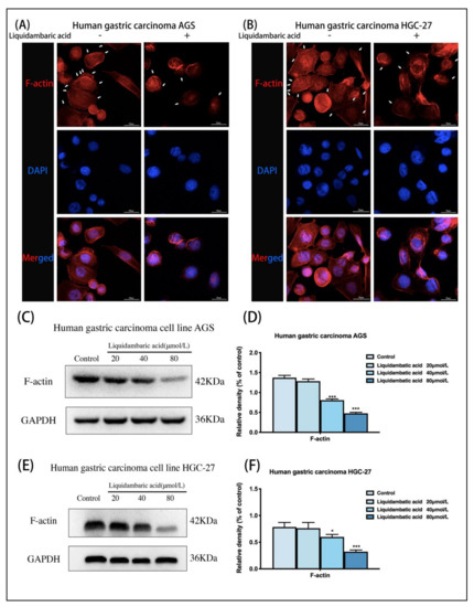 (A) Cytoskeleton staining of AGS gastric cancer cells. The white arrows indicate pseudopodia around the cells. Images of cytoskeletal staining were acquired with a confocal laser scanning microscope at 600× magnification. All the scale bars in the figure are 50 μm. (B) Cytoskeleton staining of HGC-27gastric cancer cells. The white arrows indicate pseudopodia around the cells. Images of cytoskeletal staining were acquired under confocal laser scanning microscope at 600× magnification. All the scale bars in the figure are 50 μm. (C,D) Western blot was used to detect the expression of F-actin protein in AGS gastric cancer cells 24 h after betulonic acid treatment. (E,F) Western blot was used to detect the expression of F-actin protein in gastric cancer cells HGC-27 24 h after betulonic acid treatment. * p < 0.05, *** p < 0.001.