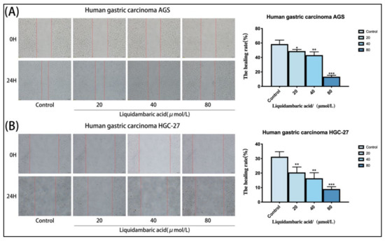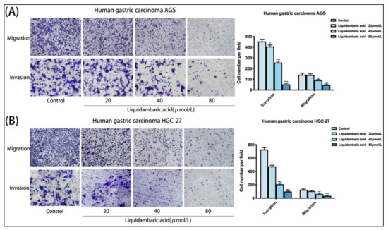 To further study the inhibitory effects of betulonic acid on the invasion and metastasis of gastric cancer cells in vitro, a wound healing experiment was used. The wound healing experiment showed that, compared with the control group, betulonic acid-treated AGS and HGC-27 gastric cancer cells group had increased an wound area and significantly weakened cell-healing ability (Figure 3A,B).