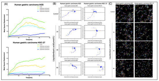 In order to further observe the movement state of cells under the action of betulonic acid, we used PerkinElmer Operetta CLS High-content Imaging System Analysis to visualize cell movement. Analysis with Harmony 4.1 software indicated that the mean square displacement (squared norm of a vector from the point of the first to the point of the current displacement observation, averaged over all cells in the well) of AGS and HGC-27 cells treated with graded concentrations of betulonic acid showed a decreasing trend with increased observation time (Figure 5A). Cell displacement was also visualized, revealing that betulonic acid could inhibit the migration of AGS and HGC-27 gastric cancer cells (Figure 5B). The cells were unlabeled and were imaged in the digital phase contrast (DPC) channel. The DPC image was used to segment the image, and the segmented cells were then tracked. With increases in drug concentration, the migration trajectories became shorter and cell migration was inhibited (Figure 5C).