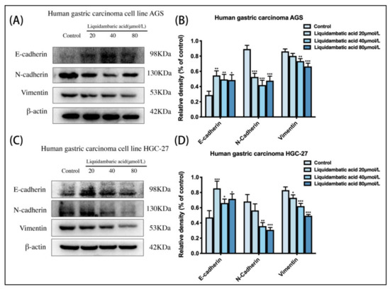 AGS cells and HGC-27 cells were treated with betulonic acid for 24 h. As shown in Figure 6, the protein expression of E-cadherin increased while that of N-cadherin and Vimentin decreased (Figure 6B,D).