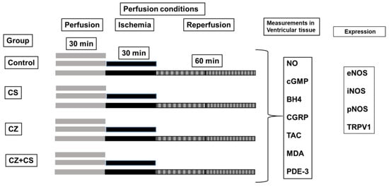 Male Wistar rats of 300–350 g were used. They were provided by the Laboratory Animal Care of the National Institute of Cardiology “Ignacio Chávez” in México. All procedures for handling animals were approved by the Institutional Ethics Committee and in accordance with the National Rules for the care and handling of experimental animals (SAGARPA, NOM-062-ZOO-1999). The animals were kept under optimal conditions of temperature and light (12 h light/dark) with a standard diet (Lab diet 5012, PMI Nutrition International, Richmond, IN, USA) and water ad libitum. The experimental animals were randomly grouped as follows: 1.—Control; 2.—CS treatment (final dose of 20 mg/kg which was distributed over 4 days); 3.—CZ treatment (final dose of 24 mg/kg distributed over 4 days) and 4.- CZ+CS treatment for 4 days. The CZ was applied first and, an hour later, the CS was injected. CS was applied at a lower dose (20 mg/kg) than that reported by Zhou et al. and by Szabados et al. [18,23] to avoid deletion of nerve endings and also because we performed a curve dose response in previous experiments with CS and CZ in isolated hearts [24]. The application of the drugs was through a s.c. injection.