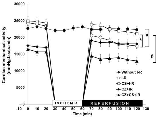 Cardiac mechanical activity in isolated and perfused hearts with perfusion (30 min), global ischemia (30 min) and reperfusion (60 min) periods for rats without treatment and after treatment with CS, CZ and combination CZ+CS. Values are the mean ± SE (n = 10 in each group) p ≤ 0.05 * CS + I-R vs. I-R; # Without I-R vs. I-R; β CS + I-R vs. CZ+CS + I-R.