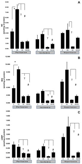 Levels in cardiac tissue of NO (A), BH4 (B) and cGMP (C). Isolated hearts were perfused in three conditions: perfusion (30 min), ischemia (30 min) and reperfusion (60 min). Hearts were obtained from control rats and treated with CS, CZ and CZ+CS. Ventricular tissue samples were obtained at the end of reperfusion. Values are the mean ± SE (n = 5 in each group p ≤ 0.05).* C vs. CS; γCS vs. CZ; βCS vs. CZ+CS.