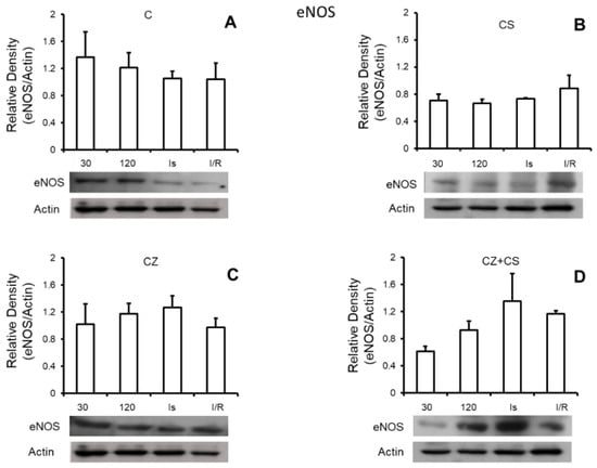 Figure 5 shows that there are no important modifications in the expression of total eNOS under any of the experimental conditions. Panel A shows the relative density of eNOS in control hearts with perfusion for 30 and 120 min, ischemic hearts, and hearts with ischemia and reperfusion. Panels B, C and D also show the relative density of eNOS under the same conditions as in panel A, but in hearts of rats treated with CS, CZ and CZ+CS, respectively.