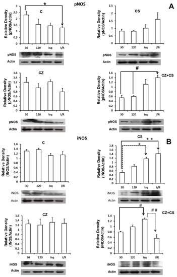 pNOS (A) and iNOS (B) expression in isolated hearts of rats treated with CS, CZ and CZ+CS under conditions of perfusion (30 and 120 min), ischemia (30 min) and reperfusion (60 min). Values are the mean ± SE (n = 5 in each group p ≤ 0.05). (A) * C 30min vs. I/R; # CZ+CS (30min vs. I/R). (B) * CS (30min vs. Is); ** CS (30min vs. I/R); # CZ+CS (30 min vs. Is); ## CZ+CS (Is vs. I/R).