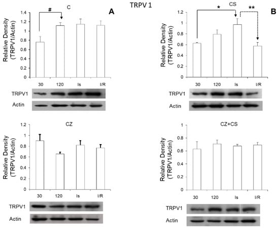 Levels of TRPV1 increased with the perfusion time (120 min) and with ischemia and reperfusion in the control group (A). Treatment with CS significantly increased the levels of TRPV1 during ischemia and the level remained at the baseline during reperfusion (B). Treatments with CZ and with the combination CZ+CS did not show changes in the levels of TRPV1 Values are the mean ± SE (n = 5 in each group p ≤ 0.05). # C (30 min vs. 120 min); * CS (30 min vs. ischemia); ** CS (ischemia vs. I/R).