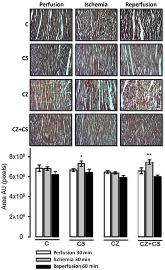 Representative photomicrographs of heart tissue after perfusion (30 min), ischemia (30 min) and reperfusion (60 min) from the four experimental groups. Area values are the mean ± SE (n = 5 in each group). The tissue was processed according to conventional histological procedures, and histological sections were made and stained by Masson’s trichrome stain at 16x. Control hearts with reperfusion showed injured in the myocytes with wavy fiber, but the CS treatment restored the morphology of the tissue. However, the CZ treatment was not capable of restoring morphology and breakage of the fibers was observed. The morphology of the tissue in the CZ+CS group was very similar to that of the C group. * CS + Ischemia (I) vs. CZ + I, p = 0.03; ** CZ + I vs. CS+CZ + I, p = 0.01.