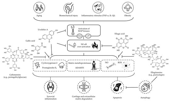 Lastly, as for the animal studies, the heterogeneity among the in vitro/ex vivo studies, as well as the supra-physiological loads of cytokines or other inflammatory molecules used to rapidly induce an OA-like pathology into the cells or tissue assessed, make it hard to directly compare the outcomes published in the scientific literature. Hence, based on the here reviewed studies, it can be concluded that HTs and their derived metabolites are capable of inhibiting the activation of MAPK pathways and the over-activation of NF-κB, blocking the consequent signaling cascades and then reducing the synthesis of pro-inflammatory and -apoptotic molecules involved in OA course, also via autophagy modulation (see overview in Figure 1).