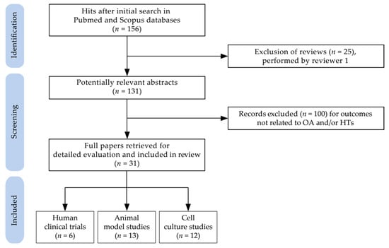 The original search yielded 156 potentially relevant publications after the exclusion of duplicates. During the screening process (reviewing of titles and abstracts), 25 records were excluded as reviews. After full-text analysis, another 100 papers were excluded. Altogether, 31 papers—ranging between 2005 and 2021—met the eligibility criteria and were selected for detailed evaluation. Specifically, six randomized clinical trials related to the HT-containing product intake in humans, 13 studies concerning the effects of consumption or treatment with HT-containing products in animal models of OA, and 12 studies on the beneficial effects of HTs or their derived metabolites assayed in cell cultures, were deeply analyzed.