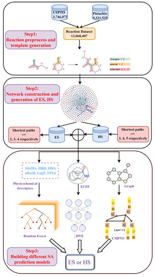The workflow of chemical reaction processing. It was divided into three steps: (1) reaction preprocess and template generation; (2) network construction and generation of ES, HS datasets; (3) building different SA prediction models.