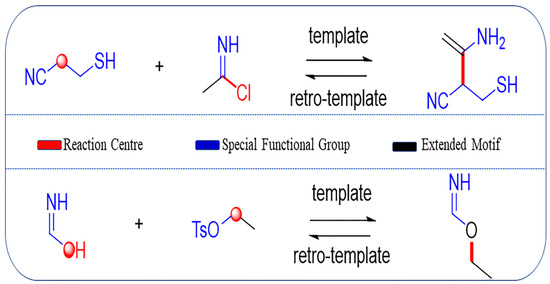 Examples of template extraction, in which colored sites are added to the reaction template. The red part refers to the reaction centers where the reaction occurs; blue part refers to the special functional groups around the reaction center; black part corresponds to the extended motif, which is the carbon atoms within a certain distance to the reaction center.
