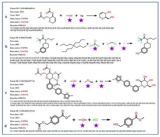 It was found that, in the reaction records processed in the previous procedure, the reagent, part of the SMILES reaction was often misplaced into the reactant part. For example, in Figure 3a, it was obviously wrong to put the sodium (Na) into the reactant list and the methanol should be solvent; in Figure 3b, the iodide ion cannot exist in this reaction, and the methylene dichloride should be solvent. The exact role of boron tri-chloride is unknown, but it is clear that boron tri-chloride and the ammonium ion do not contribute mass to the product and do not belong to the reactant. In Figure 3c, Pd is the catalyst, the sodium methanolate serves as the base, and the methyl alcohol is the solvent; in Figure 3d, the methyl alcohol is the solvent, while the HCl provides an acidic environment and is assigned to the reagent. In these problematic reaction records, the reagents/solvents in the SMILES reaction were mixed with the reactants, and this could cause troubles when identifying the correct reactant structures in the following reaction network creation step. However, this misplacement did not affect the template extraction process, as all non-product parts were treated equally in the operation. The reaction templates extracted above were then used to identify the reaction roles (mainly the reactants and reagents). A Knime [47] workflow was developed to clean up the reactant list of each reaction and the following steps were carried out to identify reagent components (as depicted in Figure 4): (1) Before extracting templates, all reagent components (solvent and catalyst) of the original reaction records were treated as reactants and formed original reactants (ORs). (2) Template extraction procedure was carried out based on the reorganized reaction SMILES, and both forward and inverse reaction templates were generated. The products were then put into the inverse reaction template to generate the predicted reactants (PRs) using RDChiral [17] functions. (3) For each reaction record, the generated PRs were then compared with ORs. For each PR component, any OR component which exactly matched or had the highest pairwise Tanimoto similarity was regarded as the true reactant corresponding to the PR. After all PRs were compared, the remaining ORs were then designated as reagents. In general, the structural similarity between reactants and reagents is quite low; reagents can easily be distinguished and removed from the reactant list.