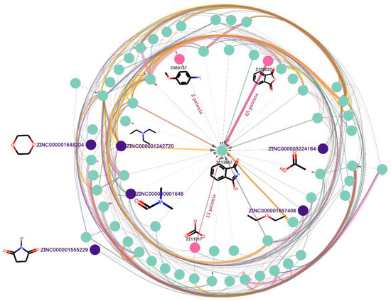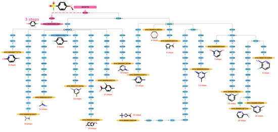 The path length generated by functions built in NetworkX (https://networkx.org/, accessed on 20 December 2021) between a starting material and a product on the graph can be referred as the possible reaction path to synthesize a compound. From a practical perspective, the route with the shortest steps to the product can be regarded as the best reaction route for synthesizing the product and the shortest reaction path (SRP) that was derived was used to model the study. As shown in Figure 7, after searching for possible reaction paths, there are 19 reaction paths that can be used to synthesize the product (node 2070779) from the respective ZINC starting materials. Among these optional paths, at least three steps are needed (from ZINC000000001885 to node 2070779 in Figure 7), so the SRP equals 3. See Figures S6–S8 for other, similar examples.