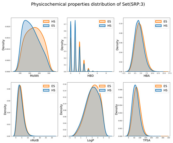 In addition, to explore whether the ES and HS can be distinguished by simple physicochemical properties, the distribution of individual properties is shown in Figure 10, Figures S9 and S10. It is observed that the difference in distribution on MW is the largest and the differences for other properties are minor. This observation is consistent with the common-sense assumption that the HS compounds usually have a larger RS and tend to have a larger MW. However, are those descriptors good enough to distinguish the ES and HS compounds? To answer this question, Random Forest [49,50] (RF) and deep forward network [51,52] (DNN) classifiers employing these descriptors were built, and their results are shown in Table 3. The accuracy of the RF classifier (RF-PCD in Table 3) was 0.592, 0.588 and 0.583 in different subsets. The accuracy of the DNN classifier (DNN-PCD) was 0.511, 0.584 and 0.565 in different subsets. These barely satisfactory results demonstrate that the performance of these physicochemical properties, either alone or collectively, when separating ES and HS molecules, is still suboptimal.