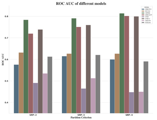 Various predictive models were built on the three subsets. For CMPNN and DNN model, the optimal parameters were determined based the performance of the validation set. Table 3 shows that, among all the models in each balanced test set, the CMPNN model always achieved the best results. It is worth mentioning that the SYBA-2 model was retrained on our own training set using the SYBA algorithm, Among the indicators (ROC AUC, ACC and MCC in Table 3), compared to other existing synthesis accessibility scoring schemes, our results show that CMPNN has a better performance than SYBA-2, albeit marginally, and outperforms SAScore and SCScore in each balanced test set.