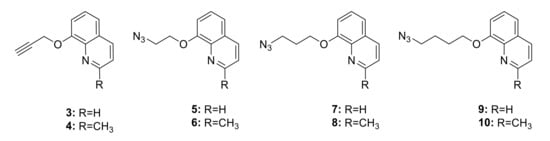 All used chemicals and solvents were purchased from Sigma-Aldrich (Saint Louis, MO, USA), ACROS Organics (Geel, Belgium), and Avantor Performance Materials (Gliwice, Poland) and were used without further purification. d-Glucose, 8-hydroxyquinoline, 8-hydroxyquinaldine, and propargyl alcohol 2 are commercially available (Sigma-Aldrich). 2-Azidoethanol 1, 8-Hydroxyquinoline derivatives 3–10 and sugar derivatives 11–24 were prepared according to the respective published procedures [26,27,28,33].
