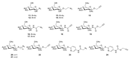 The desired metabolites were prepared by the copper(I)-catalyzed 1,3-dipolar azide-alkyne cycloaddition (CuAAC), in the variant used for the synthesis of biologically active compounds belonging to the group of the so-called click-chemistry reactions developed by Sharples [29,30,31,32]. This type of reaction allows for the quick and efficient synthesis of new compounds and combinatorial libraries. This process is characterized by high yields, stereospecificity, mild reaction conditions, the absence of by-products, and the simplicity of product purification. The CuAAC reaction was carried out between the appropriate azide or propargyl quinoline derivatives 3–10 or sugar derivatives 11–24 and 2-azidoethanol 1 or propargyl alcohol 2. A general procedure for the synthesis of metabolites is shown in Scheme 1 and Scheme 2. Used for the reaction, quinoline substrates functionalized in the 8-OH position (Figure 2) and sugar derivatives substituted at the anomeric position (Figure 3) were prepared according to the previously published procedures [26,27,28]. Propargyl alcohol 2 is a commercially available reagent, whereas 2-azidoethanol 1 was obtained by substituting 2-bromoethanol with sodium azide in DMF [33]. Confirmation of bromine atom exchange to the azide moiety was the appearance in the 13C-NMR spectra of the signal of CH2N3 carbon with a shift of about 53.5 ppm.