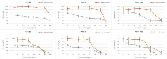The cell viability of free metabolites and metabolites loaded into micelles for HCT-116, MCF-7, and NHDF-Neo cells after 72 h of incubation. Data are presented as the mean ± standard deviation (n = 3).