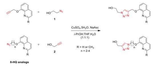 - Krawczyk, M.; Pastuch-Gawołek, G.; Pluta, A.; Erfurt, K.; Domiński, A.; Kurcok, P. 8-Hydroxyquinoline Glycoconjugates: Modifications in the Linker Structure and Their Effect on the Cytotoxicity of the Obtained Compounds. Molecules 2019, 24, 4181. [Google Scholar] [CrossRef] [PubMed] [Green Version]