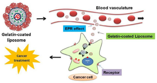 Coating can enhance the physical stability, targeting ability, and biocompatibility of nanoparticles and reduce their toxicity. Gelatin is a natural protein that is composed of several amino acids. A recent study revealed that gelatin contains arginine, glycine, and aspartate (RGD) sequences [13,14]. These RGD sequences are ligands for the integrin receptors expressed in cancer cells [15]. Therefore, they can be applied as a coating material on nanoparticles to efficiently deliver anticancer agents into cancer cells. The mechanism of cancer cell uptake using gelatin-coated liposome formulations is divided into two stages (Figure 1). First, as the vascular endothelial cells around cancer tissues have loose structures, the nano-sized liposomes can accumulate in cancer tissues owing to the enhanced permeability and retention (EPR) effect [16]. Second, the gelatin on the surface of the liposomes could link to the integrin receptors expressed in cancer cells, thus delivering the anticancer agent directly into the cancer cells.