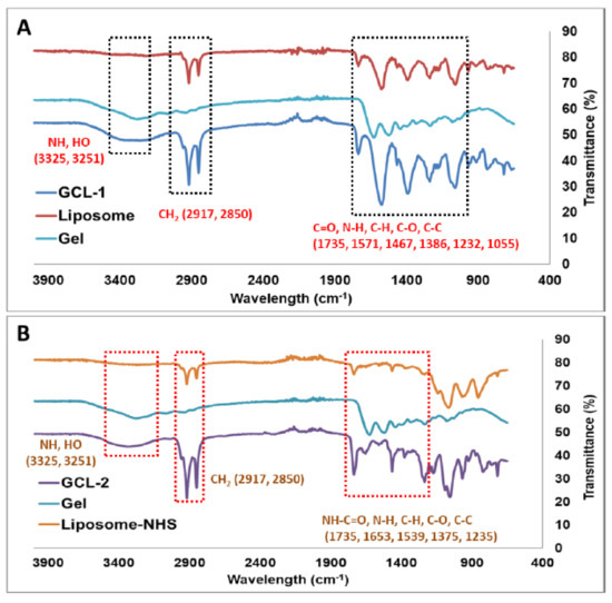Graph of Fourier-transform infrared spectroscopy data comparing gelatin-coated liposome-1 (GCL-1 (A) and CGL-1 (B)) before coating (up) and after coating (down).