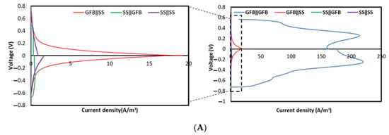 Electrochemical analyses were performed 20 days after the systems transformed into being fully biotic. The measured open circuit voltage (OCV) of the GFBǁGFB system was recorded at 0.33 V (Figure 2A), which was lower than that of SSǁGFB (0.74 V) and of GFBǁSS (0.50 V) by 55% and 34%, respectively (Figure 2B). However, the OCV of the GFBǁGFB system was slightly higher (by 12%) than that of SSǁSS (0.29 V). The highest maximum volumetric power density was that of the GFBǁGFB system (Figure 2C) (0.597 ± 0.13 W/m3), followed by the rest (Figure 2C,D, expanded scales)—67% more than that of SSǁGFB (0.196 ± 0.01 W/m3), 99.5% more than that of GFBǁSS (0.003 ± 0.0003 W/m3) and 100% more than that of SSǁSS (0.0004 ± 0.0009 W/m3). Calculations from Figure 2A,B show that GFBǁGFB had a Rint value of 0.2 kΩ, with minimal ohmic losses, which is almost 100% lower than those of other systems in this study: SSǁGFB (3 kΩ) < GFBǁSS (71 kΩ) < SSǁSS (157 kΩ).