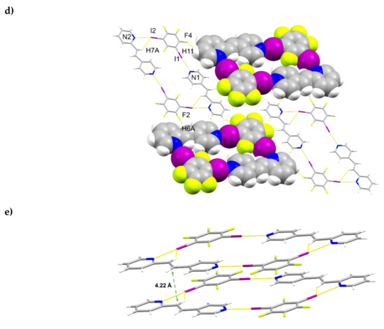 A single-crystal X-ray structure determination confirmed the hh-regiochemistry of hh-2,4-tpcb (Figure 4). The components of 2(1,3-di-I-tFb)∙(hh-2,4-tpcb) crystallize in the triclinic space group P (Table 5). The asymmetric unit consists of one full molecule of hh-2,4-tpcb and two full molecules of 1,3-di-I-tFb (Figure 4a). The 2-pyr rings of hh-2,4-tpcb adopt an anti-conformation. The components assemble primarily via N∙∙∙I X-bonds (d(N1∙∙∙I1) = 2.826(2) Å; d(N2∙∙∙I2) = 2.892(2) Å; d(N3∙∙∙I3) = 2.826(2) Å; Table 3) and secondary edge-to-edge C-H∙∙∙F forces (d(H1∙∙∙F8) ~ 2.55 Å) to form discrete, six-component assemblies (Figure 4b, Table 4). In contrast to 2(1,2-di-I-tFb)∙(ht-2,4-tpcb), wherein all four pyr N-atoms participate in N∙∙∙I X-bonds, only three N-atoms of 2(1,3-di-I-tFb)∙(hh-2,4-tpcb) participate in N∙∙∙I X-bonds (Figure 4b). Adjacent assemblies interact primarily via Type II [22] I∙∙∙I X-bonds (d(I2∙∙∙I4) = 3.6970(4) Å) to form an extended X-bonded network (Figure 4c, Table 4).