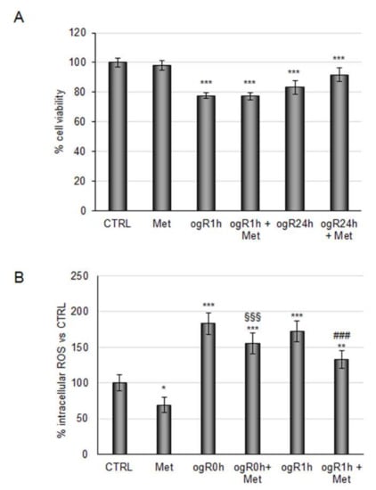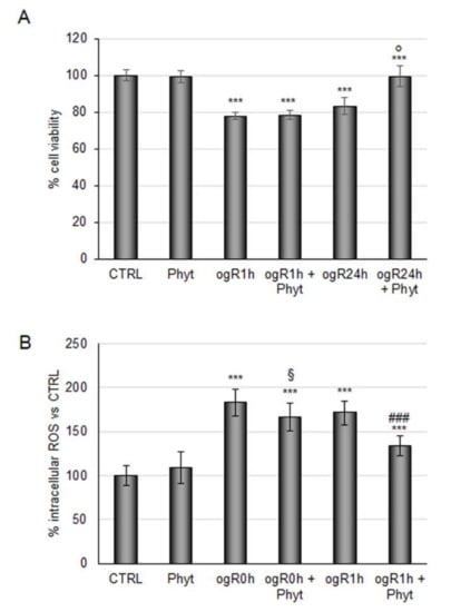 Effects of coffee pulp phytoextract against OGD/ogR-mediated oxidative stress. (A) RBE4 cells pretreated or not for 24 h with 100 μg/mL Phyt were subjected to OGD/ogR exposure (A) Cell viability evaluated by MTT assay (B) ROS intracellular evaluation by DCF fluorescence intensity. The histograms, obtained from three distinct experiments, are expressed as a percentage of cell viability or intracellular ROS as mean ± S.E. *** p < 0.001 versus CTRL (untreated cells); § p < 0.05 versus ogR0h; ### p < 0.001 versus ogR1h; p < 0.05 versus ogR24h.