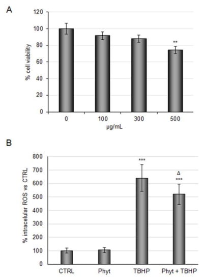 Evaluation of coffee pulp phytoextract antioxidant properties against TBHP in RBE4 cells. (A) RBE4 cells were treated with different concentrations (100, 300, 500 µg/mL) of phytoextract (Phyt) for 48 h. Then the MTT assay was performed to evaluate cell viability. (B) Intracellular ROS evaluation by DCF fluorescence intensity in RBE4 treated with TBHP 200 μM for three hours alone or in combination with 100 μg/mL pretreatment of Phyt. Phyt treatment was also tested. The histograms, obtained from three distinct experiments, are expressed as a percentage of cell viability or intracellular ROS as mean ± S.E. ** p <0.01, *** p < 0.001 versus CTRL (untreated cells); ᐃ p < 0.05 compared to TBHP.