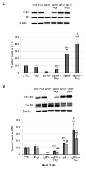 Interestingly, the Phyt pretreatment triggers phosphorylation of Akt and Erk1/2 both at ogR0h and ogR1h. Considering that during OGD, the kinases phosphorylation is almost completely inhibited, Phyt pretreatment exerts a strong effect at this time point. In the reperfusion phase, where the phosphorylation mechanisms are already restored by the availability of energy sources, a significant increment of phosphorylation state was detected. In particular, Phyt promoted a significant increase of pAktSer473/Akt ratio during OGD of about 6-fold (ogR0h + Phyt) and 50% after 1 h of reperfusion (ogR1h + Phyt) compared with nonpretreated cells (Figure 5A). In parallel, both Erks kinases phosphorylation was augmented in cells pretreated, as well as detected for Akt, showing a higher effect on p42 (Erk2) at ogR0h and on p44 (Erk1) at ogR1h. The phosphorylation ratio of p42 augmented 6-fold at ogR0h, while the p44 phosphorylated form appeared. At ogR1h, the p-p44 and p-p42 increased about 116% and 60%, respectively, compared with nonpretreated cells (Figure 5B). Although the differences in isoforms increase, a recent thorough review concludes that Erk1/2 are functionally redundant and act in a complex interplay in survival mechanisms [45]. Data obtained suggest that Phyt components could specifically activate survival signaling pathways overcoming the energy deficit.