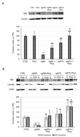 Based on the Nrf2-kinases relationship observed in previous studies [40,46], the transcription factor protein levels were then investigated. Nrf2 protein levels followed the kinases trend, with a significant reduction of about 80% during OGD and a strong increase at ogR1h (270% with respect to ogR0h). As revealed for kinases, coffee pulp Phyt pretreatment is needed to enhance the cellular response at both the time point evaluated (150% at ogR0h and 40% at ogR1h with respect to cells only subjected to OGD/ogR treatment) (Figure 6A). Moreover, Nrf2 nuclear and cytoplasmic localization analysis showed an equal distribution between the two cellular fractions, with a trend that reflects the one observed in total homogenate (Figure 6B).