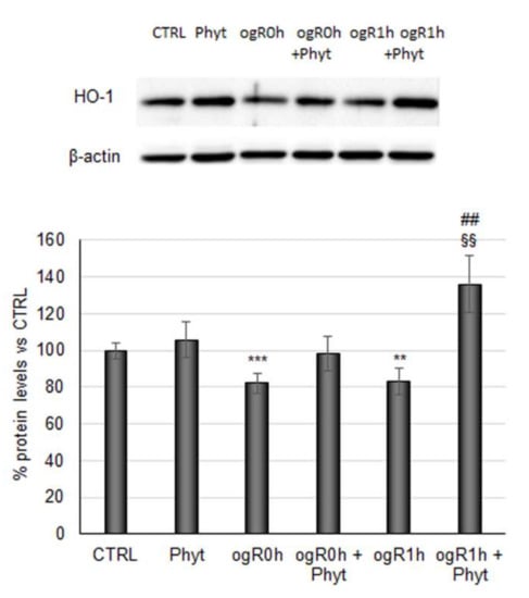 The Phyt, hence, induced the nuclear Nrf2 fraction augment both at ogR0h and ogR1h, compared with nuclear protein levels in cells subjected to the only OGD/ogR treatment, suggesting the presence of a major functionally active transcription factor. As mentioned above, Nrf2 stabilization in the nucleus results in the expression of antioxidant enzymes directly involved in the intracellular ROS neutralization [47]. Among them, the heme oxygenase-1 protein (HO-1) performs an essential role in opposing oxidative stress also under ischemic conditions [48,49]. Under OGD, HO-1 levels decreased by about 20% while they were completely rescued by pretreatment with Phyt, suggesting that Nrf2 nuclear translocation sustained the antioxidant enzyme expression. Interestingly, a significant 60% increase in HO-1 levels was detected at ogR1h in pretreated cells (ogR1h + Phyt) with respect to the ones exposed only to OGD/ogR, in which the levels remain almost stable (Figure 7).