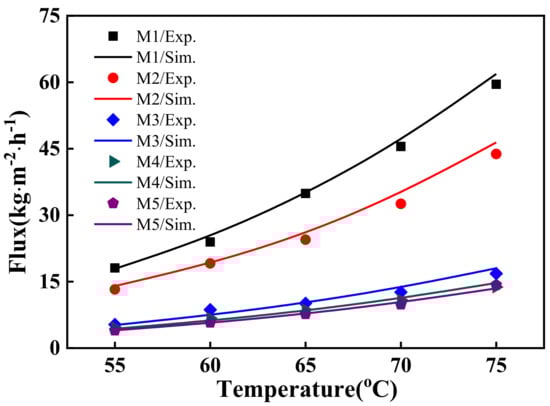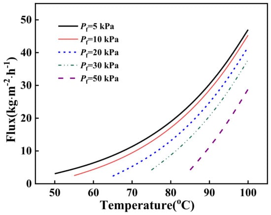 To investigate the influences of temperature and pressure on vapor transport through asymmetric ceramic membranes, simulations were performed using M5. As shown in Figure 2, the permeate flux of water increased as the vacuum degree and liquid temperature increased. These phenomena were ascribed to the increase of transmembrane pressure difference, represented in Equation (9), since an increase of the vacuum degree will lower the permeate side pressure, and an increase of the feed temperature will increase the saturated vapor pressure of water.