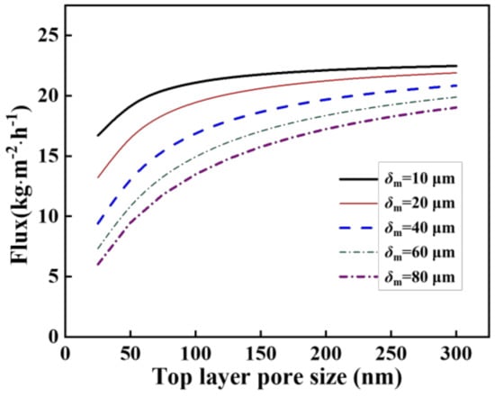 In addition to temperature and pressure, membrane parameters play important roles in gas transport through a membrane. Here, simulations were performed for various asymmetric membranes which had the same support structures (with pore size of 1.0 μm and thickness of 2.0 mm) but different top layer parameters. The effect of the pore size in the top layer on the vapor permeate flux for membranes with various top layer thicknesses can be seen in Figure 3. As illustrated, the permeate flux decreased as the thickness of the top layer increased. Moreover, the permeate flux precipitously increased as the pore sizes increased, when the pore size was smaller than 50 nm. This occurred because an increase in pore size is a great advantage for improving Knudsen diffusion and Poiseuille flow (Equation (9)). Subsequently, the increase of permeate flux became slow as the pore size of the top layer further increased. This phenomenon can be explained by the contribution of the top layer to the overall mass transfer resistance that decreased gradually with the increase of the top layer pore size.