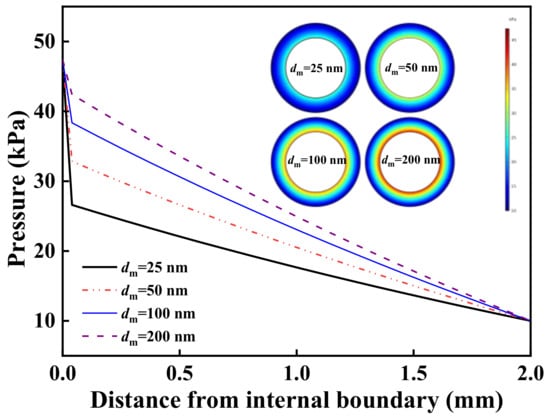 The contours of static pressure distribution for different membranes were simulated to analyze the distribution of mass transfer resistance of asymmetric membranes. As shown in Figure 4, when the pore size of the top layer was very small, the portion of pressure drop across the top layer was very high, indicating that the top layer dominated the overall mass transfer process even though it was very thin. With the increase of the top layer pore size, the mass transfer controlling step turned from the top layer to the support layer.