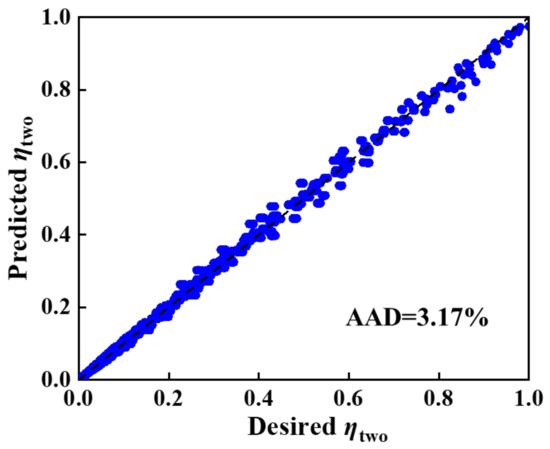 The predicted ηtwo values were plotted versus the desired ηtwo (obtained from the simulation results), as shown in Figure 6. It was found that the predicted results were in relatively good agreement with the desired ones, with an AAD of 3.17%, which indicated that Equation (4) has high fitting degree and applicability for a two-layer membrane.