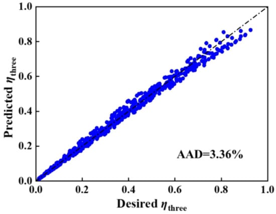 To check against the applicability of the predictive correlation of ηthree, more than 1000 simulation runs were performed, considering various membrane parameters and operating conditions. Figure 7 shows that the predictive ηthree results were in relatively good agreement with the desired ηthree values, with an AAD of 3.36%, which indicated that Equation (5) were effective.