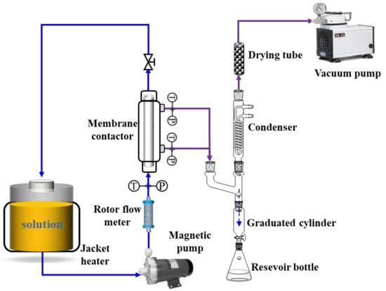 The experimental apparatus presented in Figure 8 was used for vacuum membrane distillation. All experiments were carried out in a 304 stainless membrane contactor with inner diameter of 18 mm and effective length of 110 mm (using a short module to keep the flows isothermal on both sides of the membrane). Water in a heating tank was continuously fed into the lumen side of the membrane contactor at a liquid flow of 160 L/h (under turbulence state, corresponding Reynolds number of ~7500) to minimize the temperature difference between the liquid bulk and the liquid–vapor interface. The liquid flow rate was controlled and measured by a rotameter (accuracy: ± 2%). The feed temperature and pressure conditions were monitored using thermal sensors (0−200 °C, PT100-type, Hangzhou Sinomeasure Automation Technology Co., Ltd., China) and pressure transmitters (0−0.6 MPa, SIN-P300, Hangzhou Sinomeasure Automation Technology Co., Ltd., China), respectively. Additionally, the permeable side pressure of the membrane contactor was generated by a vacuum pump and determined by a pressure transmitter (−0.1–0 MPa, SIN-P300, Hangzhou Sinomeasure Automation Technology Co., Ltd., China). The vapor was extracted from the membrane contactor and then condensed. The condensate volume was determined by a precise graduated cylinder. The experimental permeate flux can be calculated by using Equation (15).