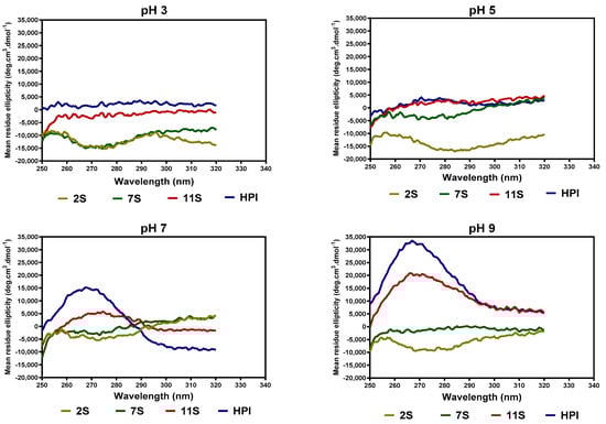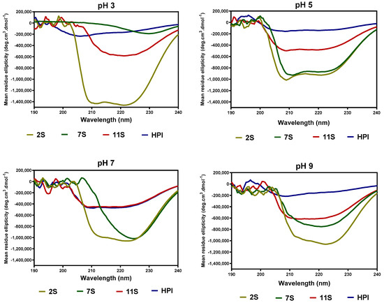 - Clara Sze, K.W.; Kshirsagar, H.H.; Venkatachalam, M.; Sathe, S.K. A circular dichroism and fluorescence spectrometric assessment of effects of selected chemical denaturants on soybean (Glycine max L.) storage proteins glycinin (11S) and β-conglycinin (7S). J. Agric. Food Chem. 2007, 55, 8745–8753. [Google Scholar] [CrossRef] [PubMed]