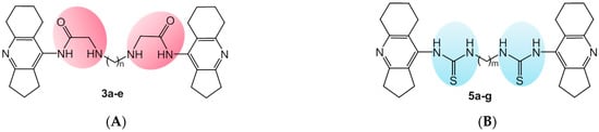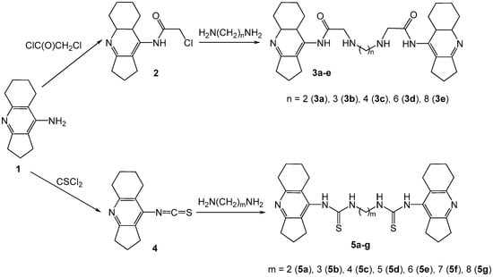 Recently, our team performed the functionalization of the amiridine molecule by acylation with chloroacetic acid chloride. The resulting amiridine chloroacetamide was reacted with piperazines, resulting in the production of a number of amiridine-piperazine hybrids as prospective multifunctional agents for AD treatment [78]. In our current work, to obtain new amiridine-based MTDLs, we used the reaction of amiridine chloroacetamide with diaminoalkanes to synthesize amiridine–amiridine homodimers with bis-N-acyl-alkylene spacers. Furthermore, we developed an additional way of functionalizing amiridine with thiophosgene, which enabled us to obtain amiridine homodimers with bis-N-thiourea-alkylene spacers.