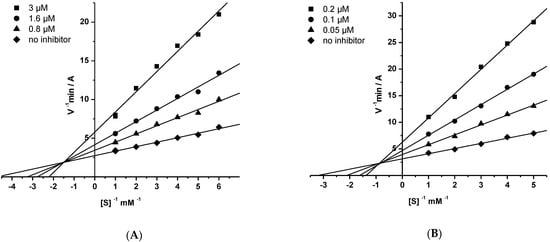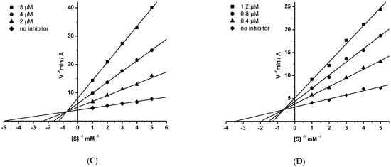 We carried out investigations of the kinetics and mechanism of AChE and BChE inhibition by the synthesized conjugates using compounds from groups 3a and 5d. Graphical analysis of the kinetic data on AChE (Figure 2A,C) and BChE (Figure 2B,D) inhibition by compounds 3a and 5d, respectively, from the Lineweaver–Burk double-reciprocal plots, showed changes in both Km and Vmax, suggesting mixed-type inhibition.