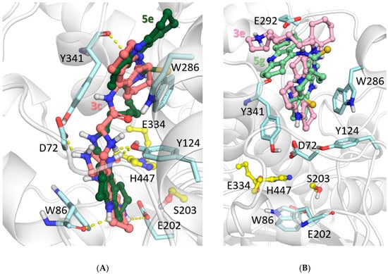 Molecular docking of compounds 3 (carbon atoms are shown in shades of red) and 5 (carbon atoms are shown in shades of green) into the AChE active site. (A) Comparative binding of compounds 3c and 5e. (B) Binding of compounds 3e and 5g to the PAS.