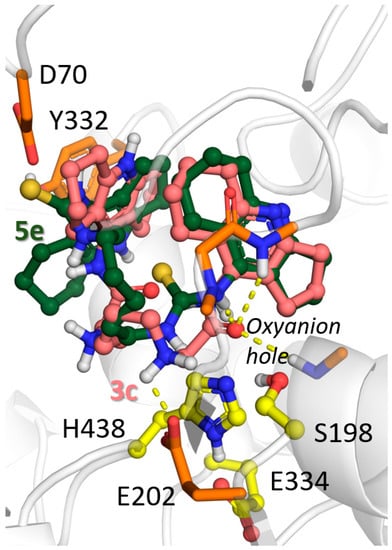 Molecular docking of compounds 3c (carbon atoms are shown pink) and 5e (carbon atoms are shown green) into the BChE active site.