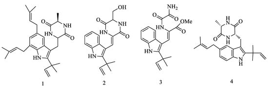 Among the natural compounds, there are some indole alkaloids, such as echinulin (1), cristatumin A (2), cristatumin D (3) and tardioxopiperazine A (4) from Eurotium cristatum EN-220 that were able to inhibit the growth of Escherichia coli and S. aureus bacteria [9] (Figure 1).