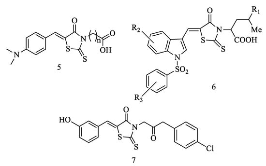 It is known that rhodanin is one of the most notorious key materials for the development of effective antibiotics. The favorable antimicrobial activity of rhodanines is due to the similarity of their structure with the chemical structure of penicillin, which has been proved by several researchers [10,11,12,13]. Rhodanine-3-alkanecarboxylic acid derivatives with p-N,N-benzylidenedialkyl (phenyl)amine moieties on benzene ring 5 were found to be active against staphylococcus, micrococcus and streptococcus strains [14]. Rhodanines bearing N-arylsulfonylindole fragment derivatives 6 exhibited inhibitory activity against S. aureus including methicillin resistant strains (MRSA) [15], while rhodanine 7 was found to be potent against methicillin-resistant Staphylococcus aureus, Staphylococcus epidermidis, Staphylococcus aureus, Enterococcus sp. and Mycobacteria (Figure 2).